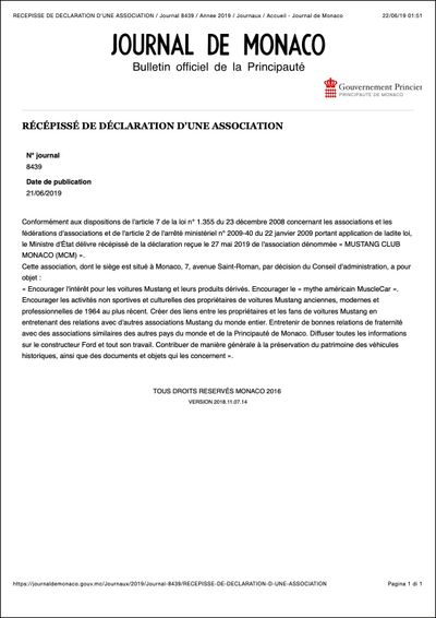 Founded and set up by Italians residing in Monaco, Mustang Club Monaco based in Monaco is legally recognized by the Monegasque government on May 27, 2019 pursuant to article 7 of law no. 1.355 on associations and federations of associations and article 2 of ministerial decree no. 2009-40 of 22 January 2009.